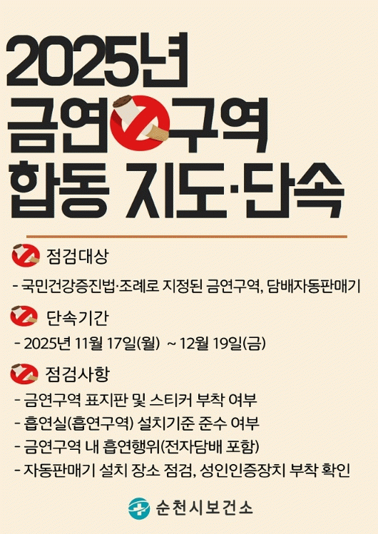 [¹Ìµð¾îÀü³² ÀÓ¼º¿Ï ±âÀÚ]¼øÃµ½Ã´Â Àü¶ó³²µµ¿Í ÇÔ²² °Ç°ÇÑ ±Ý¿¬È¯°æ Á¶¼ºÀ» À§ÇØ ¿À´Â 17ÀϺÎÅÍ 19ÀϱîÁö ±Ý¿¬ ±¸¿ª ÇÕµ¿ Áöµµ¡¤Á¡°ËÀ» ½Ç½ÃÇÑ´Ù°í ¹àÇû´Ù. À̹ø Á¡°ËÀº '±¹¹Î°Ç°ÁõÁø¹ý' Á¦9Á¶¿Í '¼øÃµ½Ã ±Ý¿¬È¯°æ Á¶¼º ¹× °£Á¢Èí¿¬ ÇÇ¡¦