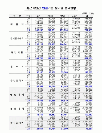 [¹Ìµð¾îÀü³² Á¦°¥´ëÁ¾ ±âÀÚ]Çѱ¹Àü·ÂÀº 3ºÐ±â °á»ê °á°ú, ¿¬°á±âÁØ ¸ÅÃâ¾× 73Á¶ 7,465¾ï¿ø, ¿µ¾÷ºñ¿ë 62Á¶ 2,051¾ï¿ø, ¿µ¾÷ÀÌÀÍÀº 11Á¶ 5,414¾ï¿øÀ» ±â·ÏÇßÀ¸¸ç, º°µµ±âÁØÀº ¸ÅÃâ¾× 72Á¶ 4,684¾ï¿ø, ¿µ¾÷ºñ¿ë 66Á¶ 9,324¾ï¿ø, ¿µ¾÷ÀÌÀÍ 5¡¦