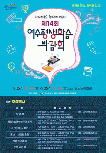 [¹Ìµð¾îÀü³² ÀüÇü¼º ±âÀÚ]¿©¼ö½Ã°¡ ¿À´Â 14ÀϺÎÅÍ 16ÀϱîÁö 3Àϰ£ Áø³²¹®¿¹È¸°ü¿¡¼ ¡®Á¦14ȸ ¿©¼ö Æò»ýÇнÀ¹Ú¶÷ȸ¡¯¸¦ °³ÃÖÇÑ´Ù°í ¹àÇû´Ù. ¡®Áñ°Å¿î ÀÏ»ó, ÇູÇÑ Àλý! Æò»ýÇнÀ Çູµµ½Ã ¿©¼ö¡¯¸¦ ÁÖÁ¦·Î ¿¸®´Â À̹ø ¹Ú¶÷ȸ¿¡ °ü³» ¡¦
