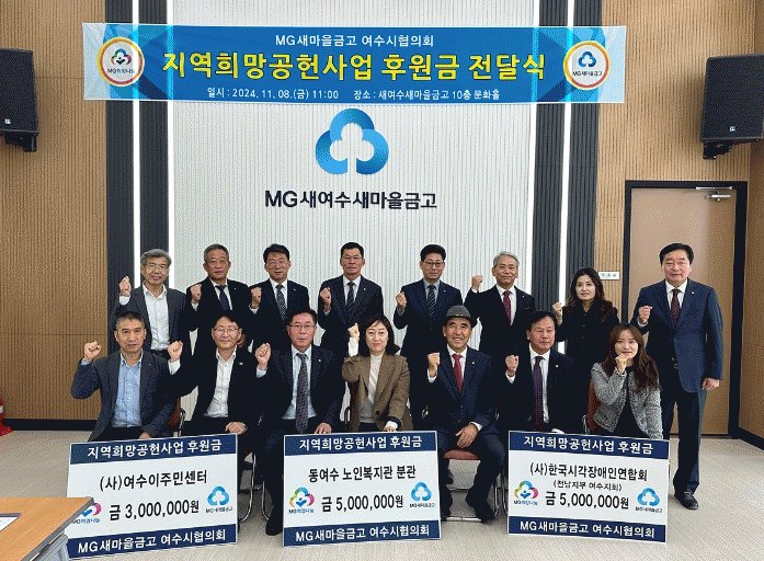 [¹Ìµð¾îÀü³² ÀüÇü¼º ±âÀÚ]MG»õ¸¶À»±Ý°í ¿©¼ö½ÃÇùÀÇȸ°¡ Áö³ 8ÀÏ Áö¿ªÈñ¸Á°øÇå»ç¾÷À¸·Î ¸¶·ÃÇÑ ¼º±Ý 1õ300¸¸ ¿øÀ» ¿©¼ö½Ã¿¡ Àü´ÞÇß´Ù. 12ÀÏ ¿©¼ö½Ã¿¡ µû¸£¸é À̹ø ÈÄ¿ø±Ý Àü´Þ½Ä¿¡ ¿©¼ö Áö¿ª 13°³ »õ¸¶À»±Ý°í ÀÌ»çÀå°ú ¿©¼ö½Ã, ¼öÇý´Üü¡¦