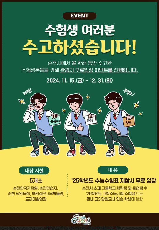 [¹Ìµð¾îÀü³² ÀÓ¼º¿Ï ±âÀÚ]¼øÃµ½Ã´Â 2025Çг⵵ ´ëÇмöÇдɷ½ÃÇèÀ» ¸¶Ä£ ¼öÇè»ýµé¿¡°Ô °ü³» ÁÖ¿ä °ü±¤Áö ¹«·áÀÔÀå ÇýÅÃÀ» Á¦°øÇÑ´Ù°í ¹àÇû´Ù. ÇýÅÃÀº 11¿ù 15ÀϺÎÅÍ 12¿ù 31ÀϱîÁö ¾à ÇÑ ´Þ ¹Ý µ¿¾È Á¦°øµÇ¸ç, ¼øÃµ½Ã¿¡ ¼ÒÀçÇÑ °íµîÇб³¡¦