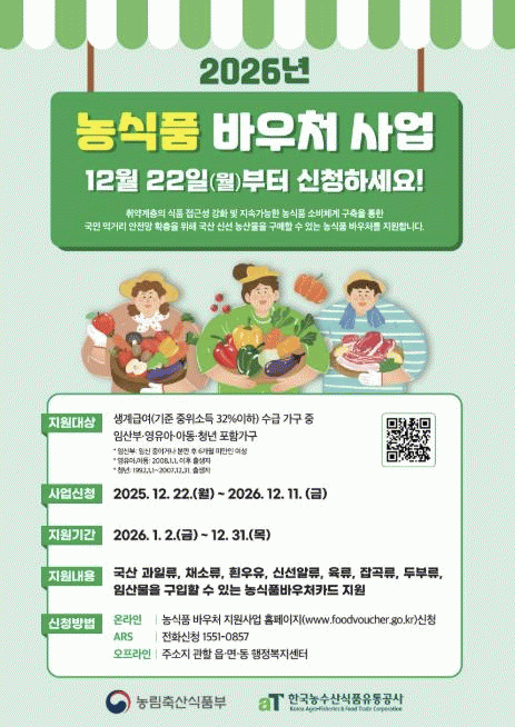 [¹Ìµð¾îÀü³² °í±Ô¼® ±âÀÚ]°Áø±ºÀÌ Ãë¾à°èÃþÀÇ ¸Ô°Å¸® Á¢±Ù¼ºÀ» ³ôÀÌ°í ±ÕÇü ÀâÈù ½Ä»ýȰÀ» Áö¿øÇϱâ À§ÇØ 2026³â ³ó½Äǰ¹Ù¿ìó Áö¿ø»ç¾÷À» ÃßÁøÇÑ´Ù. ½Åû Á¢¼ö´Â ¿À´Â 22ÀϺÎÅÍ ½ÃÀÛÇÑ´Ù. À̹ø »ç¾÷Àº »ý°è±Þ¿© ¼ö±Þ °¡±¸ Áß ÀÓ»êºÎ, ¡¦