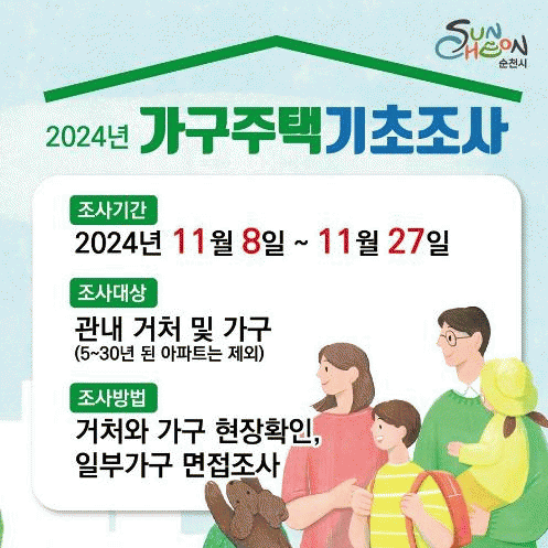 [¹Ìµð¾îÀü³² ÀÓ¼º¿Ï ±âÀÚ]¼øÃµ½Ã´Â Åë°èû°ú ÇÔ²² ¿À´Â 8ÀϺÎÅÍ 27ÀϱîÁö ¡®2024³â °¡±¸ÁÖÅñâÃÊÁ¶»ç¡¯¸¦ ½Ç½ÃÇÑ´Ù°í ¹àÇû´Ù. Á¶»ç ´ë»óÀº °ü³» ¸ðµç °Åó¿Í °¡±¸À̸ç, °ÇÃà³âµµ 5³âºÎÅÍ 30³â ¹Ì¸¸ ¾ÆÆÄÆ®´Â Á¦¿ÜµÈ´Ù. ¼øÃµ½Ã´Â ¾à 8¡¦