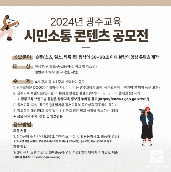 [¹Ìµð¾îÀü³² Á¦°¥´ëÁ¾ ±âÀÚ]±¤Áֽñ³À°Ã»Àº ¿À´Â 8~26ÀÏ ±³À°°¡Á·°ú ½Ã¹ÎÀÌ ÇÔ²²ÇÏ´Â ¡®2024 ±¤ÁÖ±³À° ½Ã¹Î¼ÒÅë ÄÜÅÙÃ÷ °ø¸ðÀü¡¯À» ½Ç½ÃÇÑ´Ù. À̹ø °ø¸ðÀüÀº ÀÏ¹ÝºÎ¿Í ÇлýºÎ µî 2°³·Î ³ª´² ÁøÇàµÇ¸ç, ÇлýºÎÀÇ °æ¿ì ±¤ÁÖ¿¡ °ÅÁÖ ÁßÀÎ ¡¦