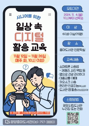[¹Ìµð¾îÀü³² ÀÓ¼º¿Ï ±âÀÚ]±¤¾ç½Ã´Â µðÁöÅÐ ¼ÒÅë¿¡ ¾î·Á¿òÀ» °Þ´Â °í·ÉÀÚÃþÀÇ Á¤º¸ Ȱ¿ë ´É·Â Çâ»óÀ» À§ÇØ ±¤¾çÁ߸¶µµ¼°ü¿¡¼ ¡®ÀÏ»ó ¼Ó µðÁöÅРȰ¿ë ±³À°¡¯À» ½Ç½ÃÇÑ´Ù°í ¾Ë·È´Ù. ±³À° ³»¿ëÀº ¡ã½º¸¶Æ®Æù ±âº» »ç¿ë¹ý ÀÍÈ÷±â ¡ã¾ÛÀ¸·Î ¡¦