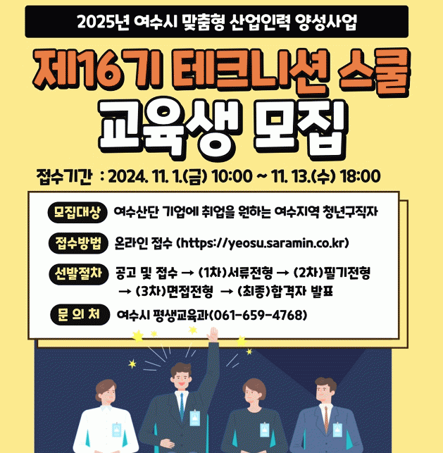 [¹Ìµð¾îÀü³² ÀüÇü¼º ±âÀÚ]¿©¼ö½Ã°¡ ¿©¼ö±¹°¡»ê´Ü ´ë±â¾÷ Ãë¾÷ÀÇ µî¿ë¹®À¸·Î ÅëÇÏ´Â ¡®Å×Å©´Ï¼Ç ½ºÄ𡯠16±â ±³À°»ý 40¸íÀ» ¿À´Â 13ÀϱîÁö ¸ðÁýÇÑ´Ù. 16±â Å×Å©´Ï¼Ç ½ºÄðÀº ´ÙÀ½ ÇØ 1¿ùºÎÅÍ 9°³¿ù°£ ÇöÀåÇü Á÷¹«±³À°, ¿µ¾î¡¤ÈÇÐ, ÀΡ¤Àû¡¦