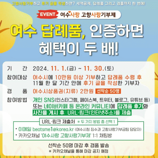 [¹Ìµð¾îÀü³² ÀüÇü¼º ±âÀÚ]¿©¼ö½Ã´Â ¿À´Â 30ÀϱîÁö °íÇâ»ç¶û±âºÎÁ¦ Âü¿© À̺¥Æ® ¡®¿©¼ö ´ä·Êǰ, ÀÎÁõÇϸé ÇýÅÃÀÌ µÎ ¹è!¡¯¸¦ ÁøÇàÇÑ´Ù. À̹ø Çà»ç´Â ¿©¼ö½Ã¿¡ 10¸¸ ¿ø ÀÌ»ó ±âºÎÇÏ°í ´ä·ÊǰÀ» ¼ö·ÉÇÑ ÈÄ Èı⠱ÛÀ» ÀÛ¼ºÇÏ¸é ¼±Âø¼ø 50¸í¿¡¡¦