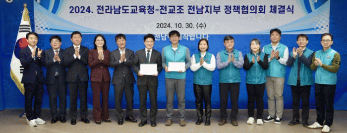 [¹Ìµð¾îÀü³² °í±Ô¼® ±âÀÚ]Àü¶ó³²µµ±³À°Ã»°ú Àü±¹±³Á÷¿ø³ëµ¿Á¶ÇÕ Àü³²ÁöºÎ´Â 30ÀÏ Àü¶ó³²µµ±³À°Ã» ÁßȸÀǽǿ¡¼ ³ë»ç ¾çÃø °ü°èÀÚµéÀÌ Âü¼®ÇÑ °¡¿îµ¥ ¡®2024³â ÇϹݱâ Á¤Ã¥ÇùÀÇȸ ü°á½Ä¡¯À» °¡Á³´Ù. ³ë¡¤»ç ¾çÃøÀº À̹ø Á¤Ã¥ÇùÀǸ¦ ÅëÇØ¡¦