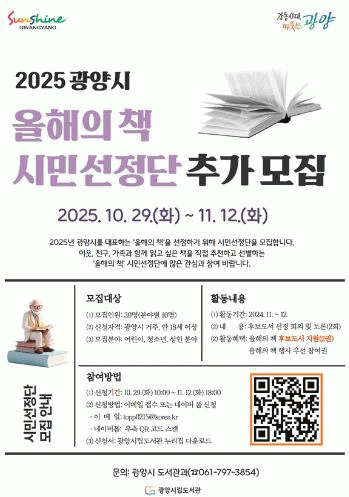 [¹Ìµð¾îÀü³² ÀÓ¼º¿Ï ±âÀÚ]±¤¾ç½Ã´Â 10¿ù 29ÀϺÎÅÍ 11¿ù 12ÀϱîÁö 2025³â ±¤¾ç½Ã ¡®¿ÃÇØÀÇ Ã¥¡¯ ½Ã¹Î¼±Á¤´Ü 28¸íÀ» Ãß°¡ ¸ðÁýÇÑ´Ù°í ¾Ë·È´Ù. ¿ÃÇØÀÇ Ã¥ ½Ã¹Î¼±Á¤´ÜÀº ½Ã¹Î Ãßõ, »çÀü ÀÚ·á Á¶»ç µîÀ» ÅëÇØ ÃßõµÈ µµ¼¸¦ ÇÔ²² Àаí ȸÀÇ¡¦
