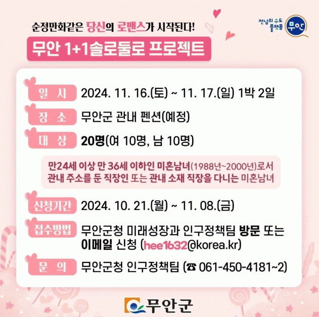 [¹Ìµð¾îÀü³² ±èÆÇ±¹ ±âÀÚ]Àü³² ¹«¾È±º(±º¼ö ±è»ê)Àº ¿À´Â 11¿ù 16ÀϺÎÅÍ 17ÀϱîÁö 1¹Ú 2ÀÏ °£ÀÇ Ã»Ãá³²³à ¸¸³² À̺¥Æ®¡®1+1 ¼Ö·ÎµÑ·Î¡¯¸¦ °³ÃÖÇÑ´Ù. À̹ø Çà»ç´Â ¹«¾È±ºÀÌ ÁÖÃÖÇϴ ù ·Î¸Ç½º À̺¥Æ®·Î ÁøÁ¤ÇÑ Àο¬À» ã°íÀÚ ÇÏ´Â Áö¿ª¡¦