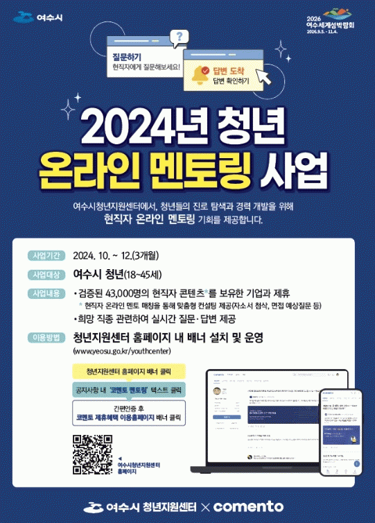 [¹Ìµð¾îÀü³² ÀüÇü¼º ±âÀÚ]¿©¼ö½Ã°¡ û³âµéÀÇ Áø·Î Ž»ö°ú °æ·Â °³¹ßÀ» À§ÇØ ¡®2024³â û³â ¿Â¶óÀÎ ¸àÅ丵 »ç¾÷¡¯À» ¿À´Â 12¿ù 31ÀϱîÁö ÃßÁøÇÑ´Ù. °ËÁõµÈ 4¸¸ 3õ¿© ¸íÀÇ ÇöÁ÷ÀÚ ÄÜÅÙÃ÷¸¦ º¸À¯Çϰí ÀÖ´Â ±â¾÷°ú Á¦ÈÞÇØ ¸¶·ÃÇÑ À̹ø ±³À°¡¦