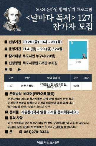[¹Ìµð¾îÀü³² °í±Ô¼® ±âÀÚ]¸ñÆ÷½Ã¸³µµ¼°üÀÌ ¿Â¶óÀÎ ÇÔ²² Àбâ ÇÁ·Î±×·¥ '2024 ³¯¸¶´Ù µ¶¼' 12±â Âü°¡ÀÚ¸¦ ¸ðÁýÇÑ´Ù. '³¯¸¶´Ù µ¶¼' 12±â´Â ¿À´Â 11¿ù 4ÀϺÎÅÍ 29ÀϱîÁö °³¼³µÇ¾î Á¸ ½ºÆ©¾îÆ® ¹Ð 'ÀÚÀ¯·Ð'À» ÇÔ²² ÀÐÀ» ¿¹Á¤ÀÌ´Ù. 20ÀÏ¡¦