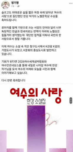 [¹Ìµð¾îÀü³² ÀüÇü¼º ±âÀÚ]¿Â ±¹¹ÎÀÌ ÇѰ ÀÛ°¡ÀÇ ³ëº§¹®Çлó ¼ö»ó ¼Ò½Ä¿¡ ±â»Ý°ú ÈïºÐÀ» °¨ÃßÁö ¸øÇÑ °¡¿îµ¥, Á¤±â¸í ¿©¼ö½ÃÀåÀÌ 12ÀÏ °³ÀÎ »çȸ°ü°è¸Á(SNS) ÆäÀ̽ººÏ °èÁ¤À» ÅëÇØ ÇÑ ÀÛ°¡¿¡°Ô ÃàÇÏ ¸Þ½ÃÁö¸¦ ÀüÇß´Ù. Á¤ ½ÃÀåÀº ¸Þ½ÃÁö¿¡¡¦