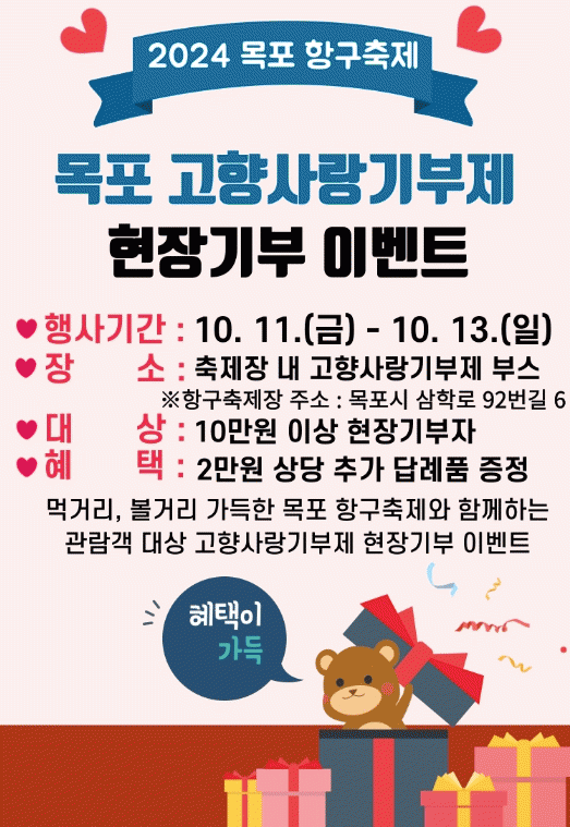 [¹Ìµð¾îÀü³² °í±Ô¼® ±âÀÚ]¸ñÆ÷½Ã°¡ 11ÀϺÎÅÍ 13ÀϱîÁö ¸ñÆ÷Ç×°ú »ïÇеµ ÀÏ¿ø¿¡¼ °³ÃֵǴ 2024³â ¸ñÆ÷Ç×±¸ÃàÁ¦¸¦ ±â³äÇØ ÃàÁ¦Àå ³» °íÇâ»ç¶û±âºÎÁ¦ È«º¸ºÎ½º¿¡¼ ÇöÀå ±âºÎÂü¿© À̺¥Æ®¸¦ ÁøÇàÇÑ´Ù. À̹ø À̺¥Æ®´Â °íÇâ»ç¶û±âºÎÁ¦ Ȱ¡¦