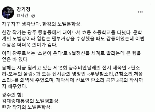 [¹Ìµð¾îÀü³² Á¦°¥´ëÁ¾ ±âÀÚ]°±âÁ¤ ±¤ÁÖ±¤¿ª½ÃÀåÀº 10ÀÏ ±¤ÁÖ Ãâ½Å ÇѰ(54) ÀÛ°¡ÀÇ Çѱ¹ÀÎ ÃÖÃÊ ³ëº§¹®Çлó ¼ö»ó ¼Ò½Ä¿¡ ¡°´ë´ÜÇÏ´Ù. °¡½¿ÀÌ ¶ß°Ì´Ù¡±°í ¼Ò°¨À» ¹àÇû´Ù. ° ½ÃÀåÀº À̳¯ ÆäÀ̽ººÏ¿¡ ¡°ÇѰ ÀÛ°¡´Â ±¤ÁÖ ÁßÈﵿ¿¡¼ Å¡¦