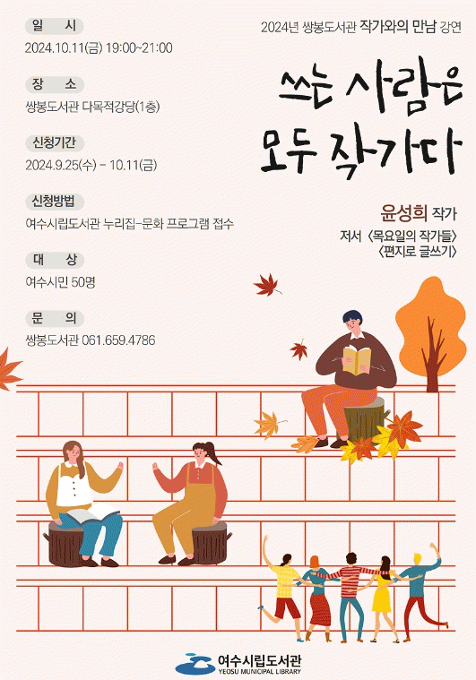 [¹Ìµð¾îÀü³² ÀüÇü¼º ±âÀÚ]¿©¼ö½Ã¸³½ÖºÀµµ¼°üÀº Ã¥À» ÅëÇØ ¼ÒÅëÇÏ´Â ¹®È È®»êÀ» À§ÇØ ¿À´Â 11ÀÏ ¿ÀÈÄ 7½Ã 1Ãþ ´Ù¸ñÀû °´ç¿¡¼ À±¼ºÈñ ÀÛ°¡¿ÍÀÇ ¸¸³² °¿¬È¸¸¦ °³ÃÖÇÑ´Ù. À±¼ºÈñ ÀÛ°¡´Â Ä«ÇǶóÀÌÆÃ, ±â¾÷»çº¸, ÀÛ»ç, ´ÜÇົ µî ´Ù¾çÇÑ ¡¦