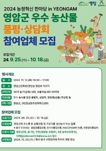 [¹Ìµð¾îÀü³² °í±Ô¼® ±âÀÚ]¿µ¾Ï±ºÀÌ 11/12ÀÏ ¿µ¾Ï±º¹Îȸ°ü¿¡¼ ¿¸®´Â ¡®¿µ¾Ï±º ¿ì¼ö ³ó½Äǰ ǰÆò¡¤»ó´ãȸ¡¯¿¡ Âü°¡ÇÒ ±â¾÷¡¤³ó°¡¸¦ ÀÌ´Þ 18ÀϱîÁö ¸ðÁýÇÑ´Ù. (Àç)Àü³²Ã¢Á¶°æÁ¦Çõ½Å¼¾ÅÍ¿Í °øµ¿ ÁÖÃÖ¡¤ÁÖ°üÇÏ´Â À̹ø ǰÆò¡¤»ó´ãȸ´Â, ¿µ¾Ï¡¦