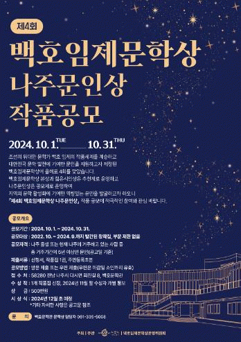 [¹Ìµð¾îÀü³² Á¦°¥´ëÁ¾ ±âÀÚ]Àü¶ó³²µµ ³ªÁֽð¡ Á¦4ȸ ¹éÈ£ÀÓÁ¦¹®ÇÐ»ó ³ªÁÖ¹®Àλó ºÐ¾ß °ø¸ð¸¦ ÁøÇàÇÑ´Ù°í 4ÀÏ ¹àÇû´Ù. ³ªÁÖ¹®ÀλóÀº ³ªÁÖ Ãâ»ý ¶Ç´Â ÇöÀç ³ªÁÖ¿¡ 5³â ÀÌ»ó °ÅÁÖ ÁßÀÎ ¹®ÀÎÀ̶ó¸é ´©±¸³ª ÀÀ¸ðÇÒ ¼ö ÀÖ´Ù. ÀÀ¸ð ´ë»óÀº ¡¦