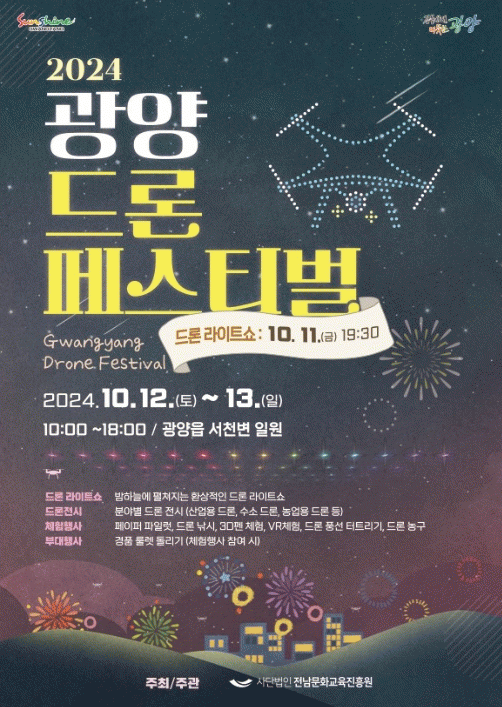 [¹Ìµð¾îÀü³² ÀÓ¼º¿Ï ±âÀÚ]±¤¾ç½Ã´Â 10¿ù 11ÀÏ Àú³áºÎÅÍ 10¿ù 13±îÁö ±¤¾çÀ¾ ¼Ãµº¯ ÀÏ¿ø¿¡¼¡® 2024³â ±¤¾ç µå·Ð Æä½ºÆ¼¹ú¡¯ÀÌ °³ÃÖµÈ´Ù°í ¹àÇû´Ù. (»ç)Àü³²¹®È±³À°ÁøÈï¿øÀÌ ÁÖ°üÇÏ´Â À̹ø Çà»ç¿¡´Â µå·Ð ¶óÀÌÆ®¼î, ¼ö¼Ò µå·Ð µî »ê¾÷¿ë¡¦