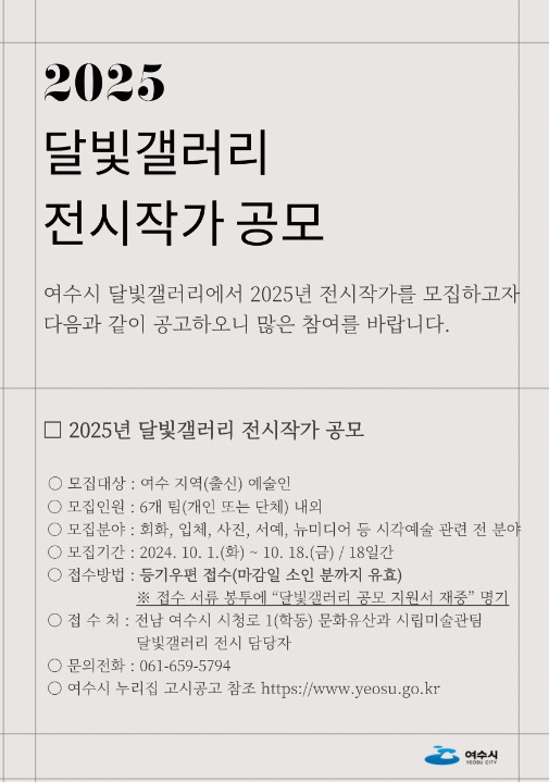[¹Ìµð¾îÀü³² ÀüÇü¼º ±âÀÚ]¿©¼ö½Ã°¡ ¿À´Â 18ÀϱîÁö 2025³â ´Þºû°¶·¯¸® Àü½Ã ÀÛ°¡¸¦ °ø°³ ¸ðÁýÇÑ´Ù. ¡®´Þºû°¶·¯¸®¡¯´Â ½Ã°¡ ¿ª·® ÀÖ´Â Áö¿ª ¿¹¼úÀÎÀ» ¹ß±¼ÇØ Àü½Ã ±âȸ¸¦ Á¦°øÇÏ°í ½Ã¹Îµé¿¡°Ô ¹®È ¿¹¼ú ÇâÀ¯ÀÇ ±âȸ¸¦ Á¦°øÇϱâ À§ÇØ ½Ã ¡¦