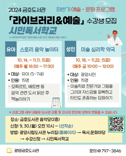 [¹Ìµð¾îÀü³² ÀÓ¼º¿Ï ±âÀÚ]±¤¾ç½Ã´Â ¿À´Â 10¿ù ¼Â° ÁÖºÎÅÍ ±¤¾ç±ÝÈ£µµ¼°ü¿¡¼ ½Ã¹ÎµéÀ» ´ë»óÀ¸·Î ÇϹݱ⠿¹¼ú¤ý¹®È ÇÁ·Î±×·¥ÀÎ ¡®¶óÀ̺귯¸®&¿¹¼ú¡¯ ¼ö°»ýÀ» ¸ðÁýÇÑ´Ù°í ¾Ë·È´Ù. ¡®¶óÀ̺귯¸®&¿¹¼ú¡¯Àº ±ÝÈ£µµ¼°üÀº Æ¯È ÁÖÁ¦ÀÎ ¿¹¼ú¡¦
