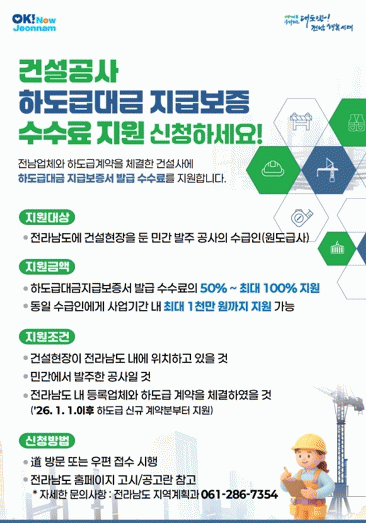 [¹Ìµð¾îÀü³² Á¦°¥´ëÁ¾ ±âÀÚ]Àü¶ó³²µµ°¡ °Ç¼³»ê¾÷ Ȱ·ÂÀ» ³ôÀ̰í Çϵµ±Þ ¾÷ü º¸È£¸¦ À§ÇØ ¡®2026³â °Ç¼³°ø»ç Çϵµ±Þ´ë±Ý Áö±Þº¸Áõ ¼ö¼ö·á Áö¿ø»ç¾÷¡¯À» È®´ë ÃßÁøÇÑ´Ù. ÀÌ »ç¾÷Àº Áö¿ª ¹Î°£ °Ç¼³ÇöÀå Áß Áö¿ª ¾÷ü¿Í Çϵµ±Þ °è¾àÀ» ÇÑ ¡¦
