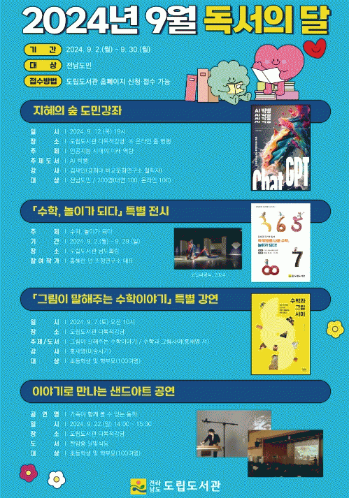 [¹Ìµð¾îÀü³² Á¦°¥´ëÁ¾ ±âÀÚ]Àü³²µµ¸³µµ¼°üÀÌ 9¿ù µ¶¼ÀÇ ´Þ µµ¹ÎÀÇ µ¶¼¹®È ÇâÀ¯¸¦ À§ÇÑ Æ¯º° Àü½Ã¿Í °¿¬, °ø¿¬, üÇè µî ´Ùä·Î¿î º¹ÇÕ¹®ÈÇà»ç¸¦ °³ÃÖÇϰí ÀÖ´Ù. ¾î¸°ÀÌ ºÐ¾ß ¼±Á¤ µµ¼ ¡®Ã¥ Àд °í¾çÀÌ ¼²ÇÄ¡¡¯ ÀúÀÚ À̰æÇý ÀÛ°¡¡¦