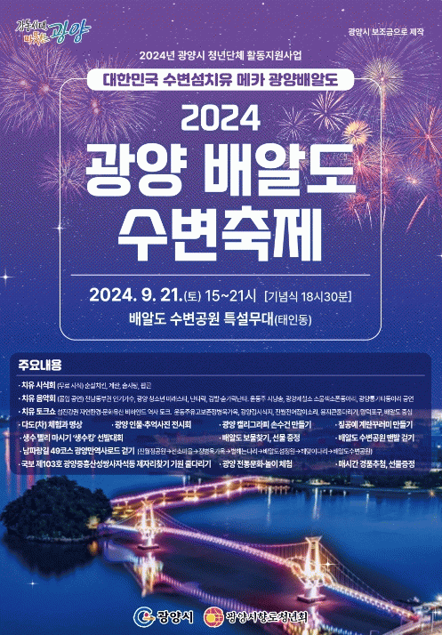[¹Ìµð¾îÀü³² ÀÓ¼º¿Ï ±âÀÚ]2024³â ±¤¾ç ¹è¾Ëµµ ¼öº¯ÃàÁ¦°¡ 9¿ù 21ÀÏ ¿ÀÈÄ 3½ÃºÎÅÍ 9½Ã±îÁö ±¤¾ç½Ã ÅÂÀε¿ ¹è¾Ëµµ ¼öº¯°ø¿ø ÀÏ¿ø¿¡¼ °³ÃֵȴÙ. ±¤¾ç ¹è¾Ëµµ ¼öº¯ÃàÁ¦´Â ¡®2024³â ±¤¾ç½Ã û³â´Üü Ȱµ¿Áö¿ø¡¯ »ç¾÷ÀÇ ÀÏȯÀ¸·Î ±¤¾ç½ÃÇâÅäû¡¦