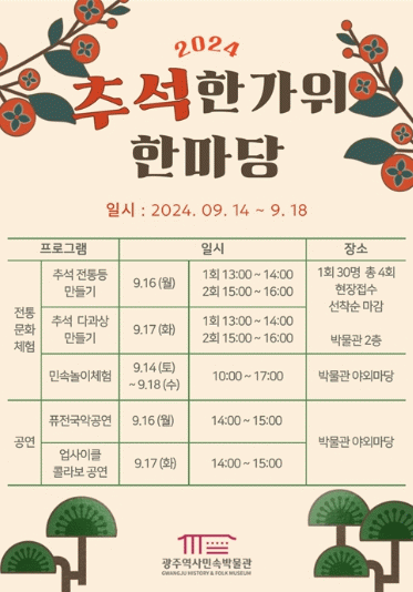 [¹Ìµð¾îÀü³² Á¦°¥´ëÁ¾ ±âÀÚ]Ãß¼® ¸íÀýÀ» ¸Â¾Æ ½Ã¹Î ´©±¸³ª Âü¿©Çϰí Áñ±æ ¼ö ÀÖ´Â ÀüÅ롤¹®È Çà»ç°¡ ±¤ÁÖ¿¡¼ dz¼ºÇÏ°Ô ¿¸°´Ù. ±¤ÁÖ±¤¿ª½Ã´Â ¿À´Â 14ÀϺÎÅÍ 18ÀϱîÁö Ç»Àü¹ÂÁöÄÃ, ±¹¾Ç»ó¼³°ø¿¬, ¹Î¼Ó³îÀÌ¡¤ÀüÅë°ø¿¹ üÇè µî ´Ù¾çÇÑ ¹®¡¦