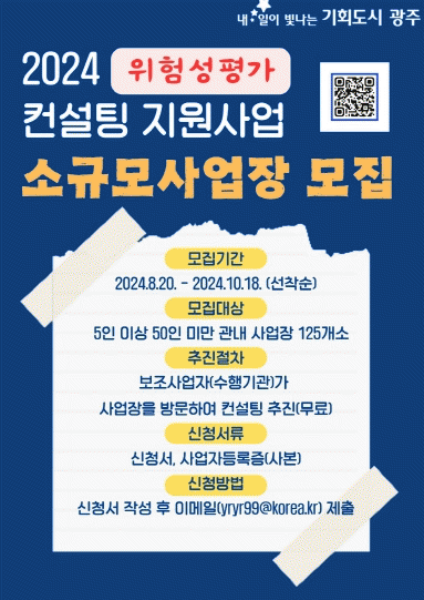 [¹Ìµð¾îÀü³² Á¦°¥´ëÁ¾ ±âÀÚ]±¤ÁÖ±¤¿ª½Ã´Â ¿À´Â 10¿ù 18ÀϱîÁö »ê¾÷ÀçÇØ ¿¹¹æÀ» À§ÇÑ À§Ç輺Æò°¡ ÄÁ¼³ÆÃÀ» ¹ÞÀ» ¼Ò±Ô¸ð »ç¾÷Àå 125°÷À» ¸ðÁýÇÑ´Ù. ÀÌ »ç¾÷Àº ¾ÈÀüº¸°Çü°è ±¸Ãà¿¡ ¾î·Á¿òÀ» °Þ´Â 5ÀÎ ÀÌ»ó 50ÀÎ ¹Ì¸¸ ¼Ò±Ô¸ð »ç¾÷Àå(°Ç¼³¾÷¡¦
