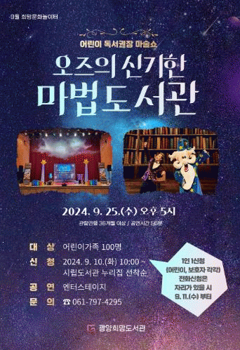 [¹Ìµð¾îÀü³² ÀÓ¼º¿Ï ±âÀÚ]±¤¾ç½Ã´Â 9¿ù 25ÀÏ 17½Ã ±¤¾çÈñ¸Áµµ¼°ü ²Þ³ª¹«±ØÀå¿¡¼ ¾î¸°ÀÌ °¡Á· 100¿© ¸íÀ» ´ë»óÀ¸·Î ¡®¿ÀÁîÀÇ ½Å±âÇÑ ¸¶¹ýµµ¼°ü¡¯ °ø¿¬À» ¿î¿µÇÑ´Ù°í ¹àÇû´Ù. ±¤¾çÈñ¸Áµµ¼°üÀÇ Æ¯º° ÇÁ·Î±×·¥ ¡®Èñ¸Á¹®È³îÀÌÅÍ¡¯´Â ¸Å¿ù¡¦