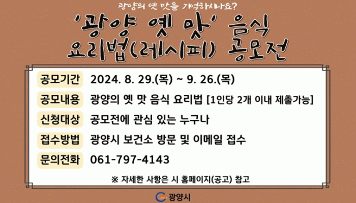 [¹Ìµð¾îÀü³² ÀÓ¼º¿Ï ±âÀÚ]±¤¾ç½Ã´Â ÀØÈù ±¤¾çÀÇ ¿¾ ¸À À½½Ä ¹ß±¼¡¤º¹¿øÀ» À§ÇÑ °ø¸ðÀüÀ» °³ÃÖÇØ ¿À´Â 9¿ù 26ÀϱîÁö ½Åû¼¸¦ ¹Þ´Â´Ù°í ¹àÇû´Ù. ¡®±¤¾çÀÇ ¿¾ ¸ÀÀ» ±â¾ïÇϽóª¿ä?¡¯¸¦ ÁÖÁ¦·Î ÇÏ´Â À̹ø °ø¸ðÀüÀº ´©±¸³ª Âü¿©ÇÒ ¼ö ÀÖ´Ù. ¡¦