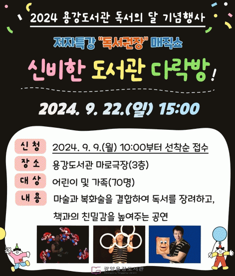 [¹Ìµð¾îÀü³² ÀÓ¼º¿Ï ±âÀÚ]±¤¾ç½Ã´Â 9¿ù µ¶¼ÀÇ ´ÞÀ» ¸ÂÀÌÇØ 22ÀÏ ¿ÀÈÄ 15½Ã ±¤¾ç¿ë°µµ¼°ü¿¡¼ ºÎ¸ð¿Í Àڳฦ ´ë»óÀ¸·Î µ¶¼ ±ÇÀå ¸ÅÁ÷ ¼î ¡®½ÅºñÇÑ µµ¼°ü ´Ù¶ô¹æ¡¯ °ø¿¬À» ÁøÇàÇÑ´Ù°í ¾Ë·È´Ù. ¡®½ÅºñÇÑ µµ¼°ü ´Ù¶ô¹æ¡¯Àº ¸¶¼ú»ç¿Í °ü¡¦