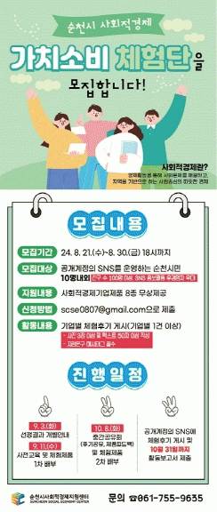 [¹Ìµð¾îÀü³² ÀÓ¼º¿Ï ±âÀÚ]¼øÃµ½Ã´Â 9¿ùºÎÅÍ 10¿ù±îÁö ¿ì¸®Áö¿ª »çȸÀû°æÁ¦±â¾÷ Á¦Ç°À» üÇèÇϰí SNS¸¦ ÅëÇØ Á¦Ç° È«º¸¸¦ ÇÏ´Â ¡®°¡Ä¡¼Òºñ üÇè´Ü¡¯À» ¿î¿µÇÑ´Ù°í ¹àÇû´Ù. ÀÌ ÇÁ·Î±×·¥Àº Áö¿ª »çȸÀû°æÁ¦±â¾÷ÀÇ Á¦Ç°À» ³Î¸® ¾Ë¸®°í »çȸ¡¦