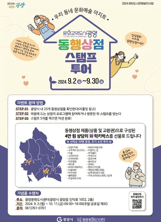 [¹Ìµð¾îÀü³² ÀÓ¼º¿Ï ±âÀÚ]±¤¾ç½Ã´Â ¿À´Â 9¿ù 2ÀϺÎÅÍ ÇÑ ´Þ°£ ±¤¾ç¹®Èµµ½Ã¼¾ÅͰ¡ ±¤¾ç½Ã ³» 23°³ ¡®µ¿Çà»óÁ¡¡¯°ú ÇÔ²² ½ºÅÆÇÁ Åõ¾î À̺¥Æ®¸¦ ÁøÇàÇÑ´Ù°í ¾Ë·È´Ù. ÀÏ»ó¹®È¾ÆÁöÆ® ¡®µ¿Çà»óÁ¡¡¯Àº Ä«Æä, °ø¹æ °°Àº ±âÁ¸ÀÇ ¿µ¾÷ÀåÀ» ¹®È°ø¡¦