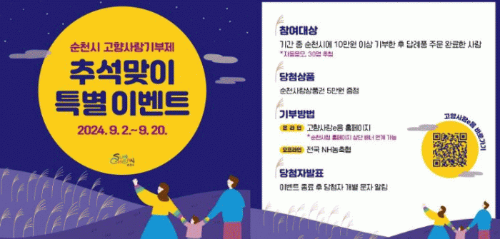 [¹Ìµð¾îÀü³² ÀÓ¼º¿Ï ±âÀÚ]¼øÃµ½Ã°¡ Ãß¼®À» ¸Â¾Æ ¿À´Â 9¿ù 2ÀϺÎÅÍ 20ÀϱîÁö¡°¼øÃµ °íÇâ»ç¶û±âºÎÁ¦ Ãß¼®¸ÂÀÌ Æ¯º° À̺¥Æ®¡±¸¦ ÁøÇàÇÑ´Ù. À̺¥Æ® ±â°£ Áß °íÇâ»ç¶ûeÀ½ ´©¸®ÁýÀ̳ª ³óÇùÀ» ¹æ¹®ÇÏ¿© ¼øÃµ½Ã¿¡ 10¸¸¿ø ÀÌ»ó ±âºÎÇÏ°í ´ä·Êǰ ½Å¡¦