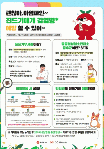 [¹Ìµð¾îÀü³² Á¦°¥´ëÁ¾ ±âÀÚ]±¤ÁÖ±¤¿ª½Ã´Â Ãß¼®À» ¾ÕµÎ°í ¹úÃÊ¡¤¼º¹¦³ª ³óÀÛ¾÷ µî ¾ß¿ÜȰµ¿¶§ Áøµå±â ¹°¸²¿¡ ÁÖÀÇÇÒ °ÍÀ» ´çºÎÇß´Ù. Áøµå±â ¸Å°³ °¨¿°º´Àº ¹ÙÀÌ·¯½º³ª ¼¼±Õ¿¡ °¨¿°µÈ ÀϺΠÁøµå±â¿¡ ¹°·Á °¨¿°µÇ´Â ÁúȯÀ¸·Î ´ëÇ¥ÀûÀ¸·Î Âꡦ