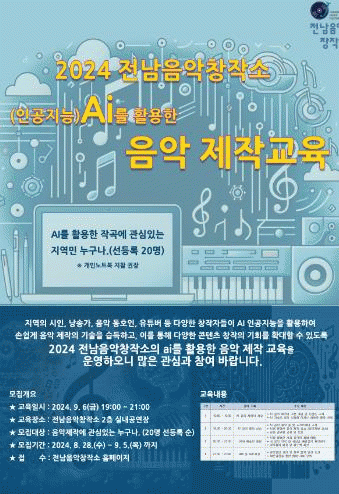 [¹Ìµð¾îÀü³² °í±Ô¼® ±âÀÚ]Àü³²À½¾ÇâÀÛ¼Ò(°Áø±º ¼ÒÀç)´Â ¿À´Â 9¿ù 6ÀÏ, Áö¿ª âÀÛÀÚµéÀ» ´ë»óÀ¸·Î AI ÀΰøÁö´ÉÀ» Ȱ¿ëÇÑ À½¾Ç Á¦ÀÛ ±³À°À» ¿î¿µÇÑ´Ù°í ¹àÇû´Ù. À̹ø ±³À°Àº ÷´Ü ±â¼úÀ» Ȱ¿ëÇÑ À½¾Ç Á¦ÀÛÀÇ ±âÃÊ °³³ä°ú ½Ç½ÀÀ» ÅëÇØ Âü¡¦