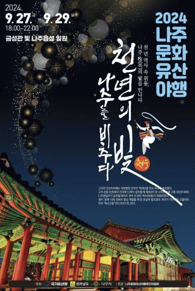 [¹Ìµð¾îÀü³² Á¦°¥´ëÁ¾ ±âÀÚ]Àü¶óµµ õ ³â ¿ª»çÀÇ Áß½ÉÁö ³ªÁֽÿ¡¼ ¹®ÈÀ¯»êÀ» Ȱ¿ëÇÑ ¹ã°Å¸® ÃàÁ¦°¡ 9¿ù ¿¸°´Ù. Àü¶ó³²µµ ³ªÁÖ½Ã(½ÃÀå À±º´ÅÂ)´Â ¿À´Â 9¿ù 27ÀϺÎÅÍ 29ÀϱîÁö 3Àϰ£ ³ªÁÖÀ¾¼º ÀÏ¿ø¿¡¼ ¡®2024³â ³ªÁÖ ¹®ÈÀ¯»ê ¾ßÇ࡯¡¦