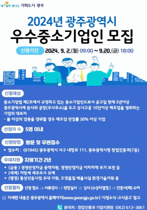 [¹Ìµð¾îÀü³² Á¦°¥´ëÁ¾ ±âÀÚ]±¤ÁÖ±¤¿ª½Ã´Â ¿À´Â 9¿ù 2ÀϺÎÅÍ 20ÀϱîÁö Áß¼Ò±â¾÷ÀÎÀÇ ÀÚ±à½É°ú Áö¿ª±â¾÷ÀÇ °æÀï·ÂÀ» ³ôÀ̱â À§ÇØ ¡®2024³â ±¤ÁÖ±¤¿ª½Ã ¿ì¼öÁß¼Ò±â¾÷ÀÎ»ó¡¯ Èĺ¸ÀÚ¸¦ °ø¸ðÇÑ´Ù. °ø¸ð ´ë»óÀº °ø°íÀÏ(27ÀÏ) ±âÁØ 3³â ÀÌ»ó ±¤¡¦