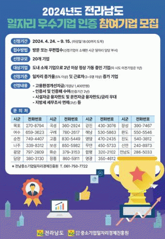 [¹Ìµð¾îÀü³² ÀüÇü¼º ±âÀÚ]¿©¼ö½Ã´Â °ü³» ±â¾÷À» ´ë»óÀ¸·Î ¡®2024³â ÀÏÀÚ¸® ¿ì¼ö±â¾÷ ÀÎÁõ»ç¾÷¡¯ Âü¿©±â¾÷À» ³»´Þ 13ÀϱîÁö ¸ðÁýÇÑ´Ù. Àü¶ó³²µµ°¡ ÁÖ°üÇÏ´Â ¡®ÀÏÀÚ¸® ¿ì¼ö±â¾÷ ÀÎÁõ»ç¾÷¡¯Àº ÀÏÀÚ¸® âÃâ ¹× ±Ù·ÎÀÚ °í¿ë¾ÈÁ¤¿¡ ±â¿©ÇÑ 20°³¡¦
