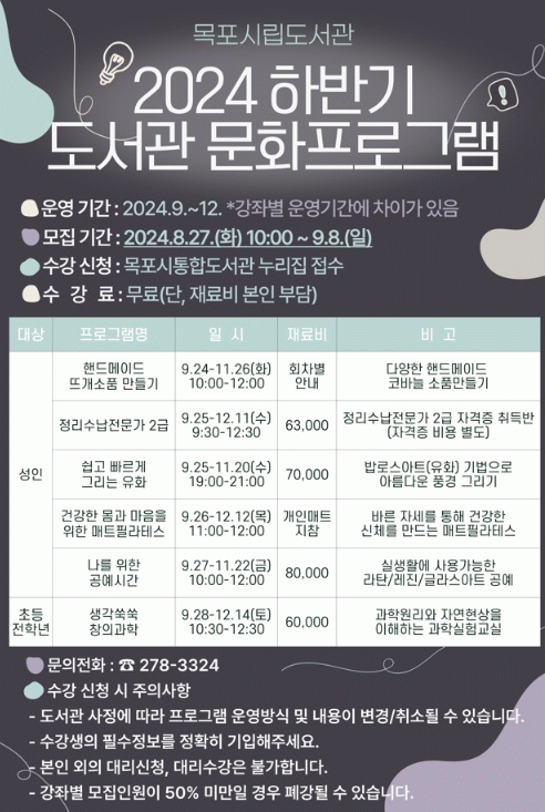 [¹Ìµð¾îÀü³² °í±Ô¼® ±âÀÚ]¸ñÆ÷½Ã¸³µµ¼°üÀº ¿À´Â 9¿ù 24ÀϺÎÅÍ 12¿ù 14ÀϱîÁö 2024 ÇϹݱ⠵µ¼°ü ¹®ÈÇÁ·Î±×·¥À» ¿î¿µÇÑ´Ù. À̹ø »ó¹Ý±â ÇÁ·Î±×·¥Àº ¼ºÀΰú Ãʵî»ýÀ» ´ë»óÀ¸·Î ¹®È¡¤¿¹¼ú¡¤Ã¼Çè µî ´Ù¾çÇÑ ºÐ¾ßÀÇ 6°³ °Á¸¦ ÁøÇàÇÑ´Ù.¡¦