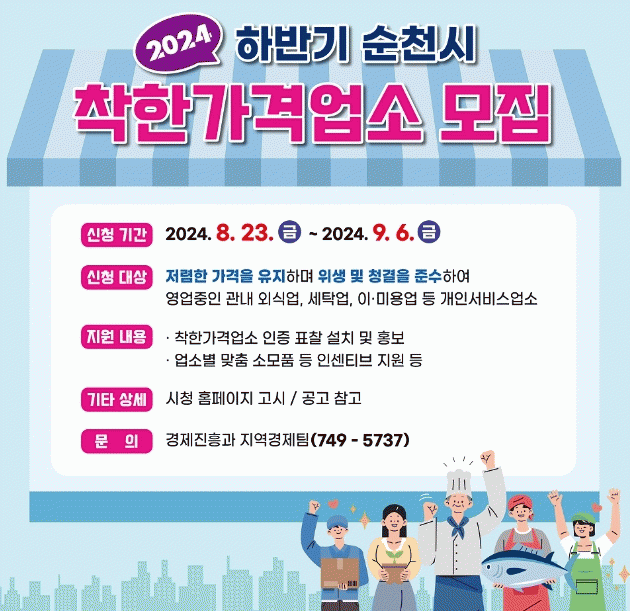 [¹Ìµð¾îÀü³² ÀÓ¼º¿Ï ±âÀÚ]¼øÃµ½Ã´Â ¼¹Î °æÁ¦»ýȰ ºÎ´ãÀ» ¿ÏÈÇϰí Áö¿ª ¹°°¡¾ÈÁ¤ ¹× Áö¿ª°æÁ¦ Ȱ¼ºÈ¿¡ ±â¿©Çϴ¡®ÂøÇѰ¡°Ý¾÷¼Ò¡¯¸¦ 9¿ù 6ÀϱîÁö ¸ðÁýÇÑ´Ù°í ¹àÇû´Ù. ¡®ÂøÇѰ¡°Ý¾÷¼Ò¡¯´Â Àα٠»ó±ÇÀÇ Æò±Õ °¡°Ýº¸´Ù Àú·ÅÇÑ °¡°ÝÀ¸·Î ¾ç¡¦