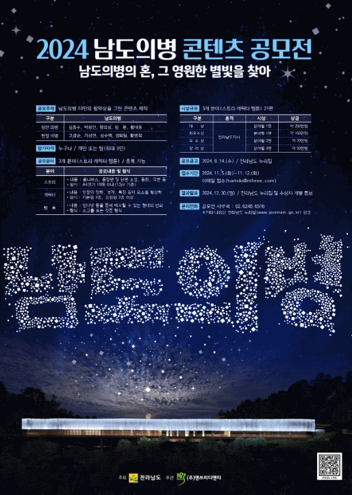 [¹Ìµð¾îÀü³² Á¦°¥´ëÁ¾ ±âÀÚ]Àü¶ó³²µµ´Â °Ç¸³ ÁßÀÎ ³²µµÀǺ´¿ª»ç¹Ú¹°°ü Àü½Ã¿¡ Ȱ¿ëÇÒ ´Ù¾çÇÑ ÄÜÅÙÃ÷ ¹ß±¼À» À§ÇØ ¡®2024 ³²µµÀǺ´ ÄÜÅÙÃ÷ °ø¸ðÀü¡¯À» °³ÃÖÇÑ´Ù°í ¹àÇû´Ù. °ø¸ðÀüÀº ¡®³²µµÀǺ´ÀÇ È¥, ±× ¿µ¿øÇÑ º°ºûÀ» ã¾Æ¡¯¶ó´Â ÁÖÁ¦·Î¡¦