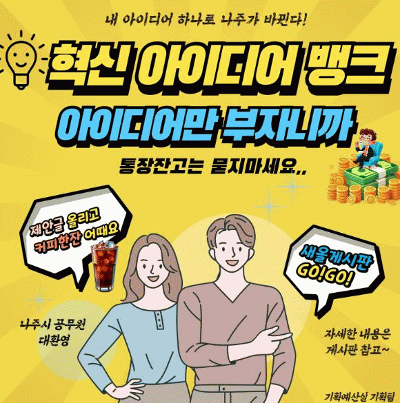 [¹Ìµð¾îÀü³² Á¦°¥´ëÁ¾ ±âÀÚ]Àü¶ó³²µµ ³ªÁֽð¡ ¼Ò¼Ó Á÷¿øµéÀÇ Á¤Ã¥ ¹ß±¼À» µ¶·ÁÇÏ°í ³ª¼¹´Ù. ³ªÁֽô ¹Î¼± 8±â ½ÃÁ¤ Àü¹Ý¿¡ ´ëÇÑ °ø¹«¿øÀÇ Á¤Ã¥ Á¦¾È ⱸÀÎ ¡®³ªÁÖ Çõ½Å ¾ÆÀ̵ð¾î ¹ðÅ©¡¯¸¦ ¿ÃÇØ ù ¿î¿µÇÑ´Ù°í 19ÀÏ ¹àÇû´Ù. Çõ½Å ¾Æ¡¦