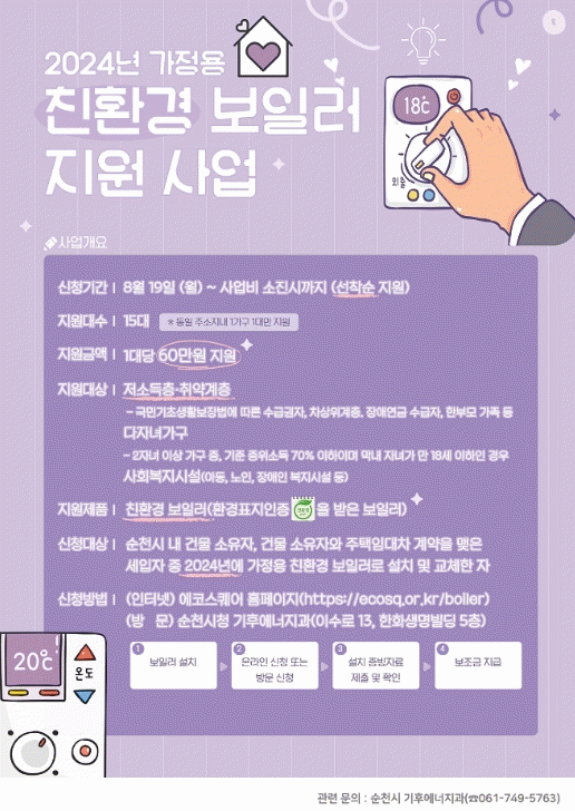 [¹Ìµð¾îÀü³² ÀÓ¼º¿Ï ±âÀÚ]¼øÃµ½Ã´Â ¿À´Â 19ÀϺÎÅÍ Àú¼ÒµæÃþÀÇ ³¹æºñ ºÎ´ãÀ» ÁÙÀÌ°í ¹Ì¼¼¸ÕÁö Àú°¨ ¹× ´ë±âÁú °³¼±À» À§ÇÑ ¡®°¡Á¤¿ë ģȯ°æ º¸ÀÏ·¯ ¼³Ä¡ºñ Áö¿ø »ç¾÷¡¯À» ½ÃÀÛÇÑ´Ù°í ¹àÇû´Ù. ½Ã´Â ¿ÃÇØ Àú¼ÒµæÃþ ¹× Ãë¾à°èÃþ(±âÃÊ»ýȰ¼ö¡¦