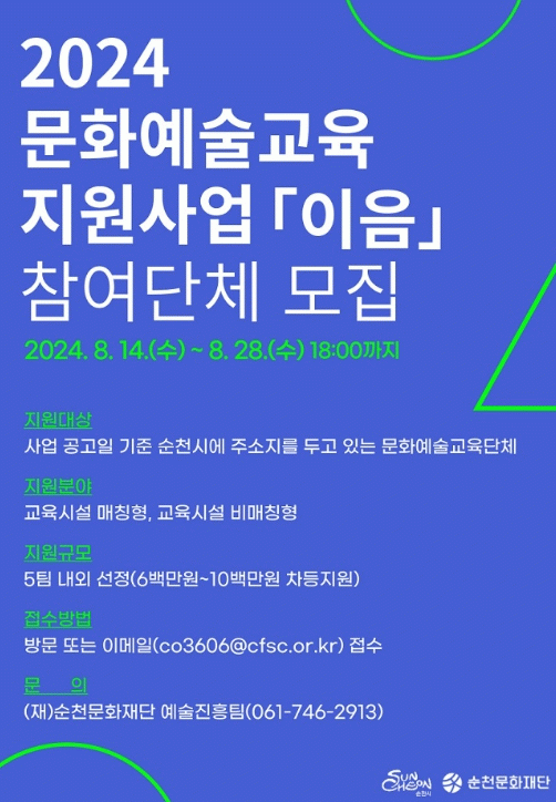 [¹Ìµð¾îÀü³² ÀÓ¼º¿Ï ±âÀÚ](Àç)¼øÃµ¹®ÈÀç´ÜÀº ¿À´Â 28ÀϱîÁö ¡®2024 ¹®È¿¹¼ú±³À° Áö¿ø»ç¾÷¡¸ÀÌÀ½¡¹¡¯ Âü¿© ´Üü¸¦ °ø°³ ¸ðÁýÇÑ´Ù°í ¹àÇû´Ù. ¡®ÀÌÀ½ »ç¾÷¡¯Àº ¹®È¿¹¼ú »ç°¢Áö´ë¿¡ ÀÖ´Â °èÃþ(¾Æµ¿, Àå¾ÖÀÎ, ³ëÀÎ, ´Ù¹®È µî)¿¡°Ô ¹®È Ç⡦