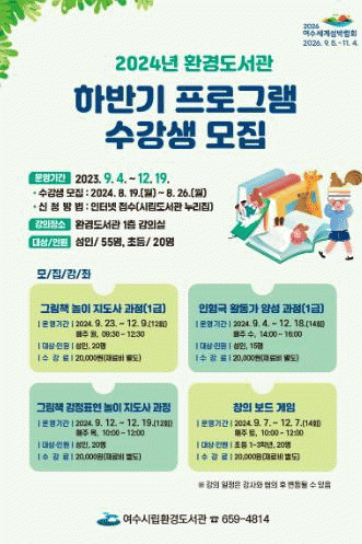 [¹Ìµð¾îÀü³² ÀüÇü¼º ±âÀÚ]¿©¼ö½Ã¸³È¯°æµµ¼°üÀÌ 9¿ùºÎÅÍ °³°ÇÏ´Â ¡®ÇϹݱâ ÇÁ·Î±×·¥¡¯¿¡ Âü¿©ÇÒ ¼ö°»ý 75¸íÀ» ¸ðÁýÇÑ´Ù. °³¼³ °Á´ ¡ã±×¸²Ã¥ ³îÀÌ Áöµµ»ç °úÁ¤(1±Þ) ¡ã ÀÎÇü±Ø Ȱµ¿°¡ ¾ç¼º °úÁ¤(1±Þ) ¡ã±×¸²Ã¥ °¨Á¤Ç¥Çö ³îÀÌ Áöµµ»ç¡¦