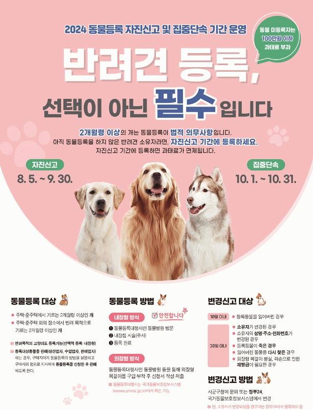 [¹Ìµð¾îÀü³² ÀÓ¼º¿Ï ±âÀÚ]±¤¾ç½Ã´Â ¹Ý·Á°ß µî·Ï Ȱ¼ºÈ ¹× µî·Ï Á¤º¸ÀÇ ÇöÇàȸ¦ À§ÇØ ¿À´Â 9¿ù 30ÀϱîÁö, 'µ¿¹°µî·Ï ÀÚÁø½Å°í ±â°£'À» ¿î¿µÇÑ´Ù°í ¹àÇû´Ù. µ¿¹°º¸È£¹ý¿¡ µû¶ó ÁÖÅÃ, ÁØÁÖÅÿ¡¼ ±â¸£°Å³ª ±× ¿ÜÀÇ Àå¼Ò¿¡¼ ¹Ý·Á ¸ñÀûÀ¸·Î¡¦