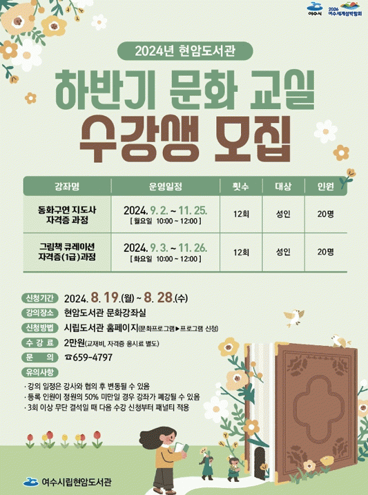 [¹Ìµð¾îÀü³² ÀüÇü¼º ±âÀÚ]¿©¼ö½Ã¸³Çö¾Ïµµ¼°üÀÌ 9¿ùºÎÅÍ °³°ÇÏ´Â ÇϹݱ⠹®È±³½Ç¿¡ Âü¿©ÇÒ ¼ö°»ý 40¸íÀ» ¸ðÁýÇÑ´Ù. °³¼³°Á´ ¡ãµ¿È±¸¿¬ Áöµµ»ç ÀÚ°ÝÁõ °úÁ¤ ¡ã±×¸²Ã¥ Å¥·¹ÀÌ¼Ç ÀÚ°ÝÁõ(1±Þ) °úÁ¤ µî 2°³ °Á·Î, ¿À´Â 9¿ù 2ÀϺÎÅÍ¡¦